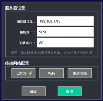 終端服務器設置中的服務器地址為終端需要連接到信息發(fā)布服務器電腦的IP地址(注:需要填寫電腦實際IP地址,請不要填127.0.0.1的地址)或者域名(域名前請不要添加http://前綴);控制端口為終端實時在線控制服務端口號如9090;下載端口為內容下載服務器端口號如80??刂贫丝诤拖螺d端口實際上是服務器端的配置參數,終端需要連接到服務器就必須和服務器的設置端口完全一致。