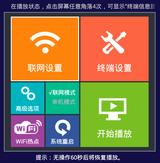 終端后臺設置界面包括7個子功能按鈕(注:若軟件界面有差異是因為未更新到最新版本,但不影響使用可以忽略):聯(lián)網設置、終端設置、高級選項、聯(lián)網/單機模式、WiFi熱點、系統(tǒng)重啟和開始播放。
