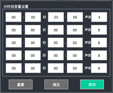 音量設置界面如下圖所示,最多可指定5個不同時段的音量,默認情況下全天不分時段則只需要指定第一段00:00~23:59的音量值。