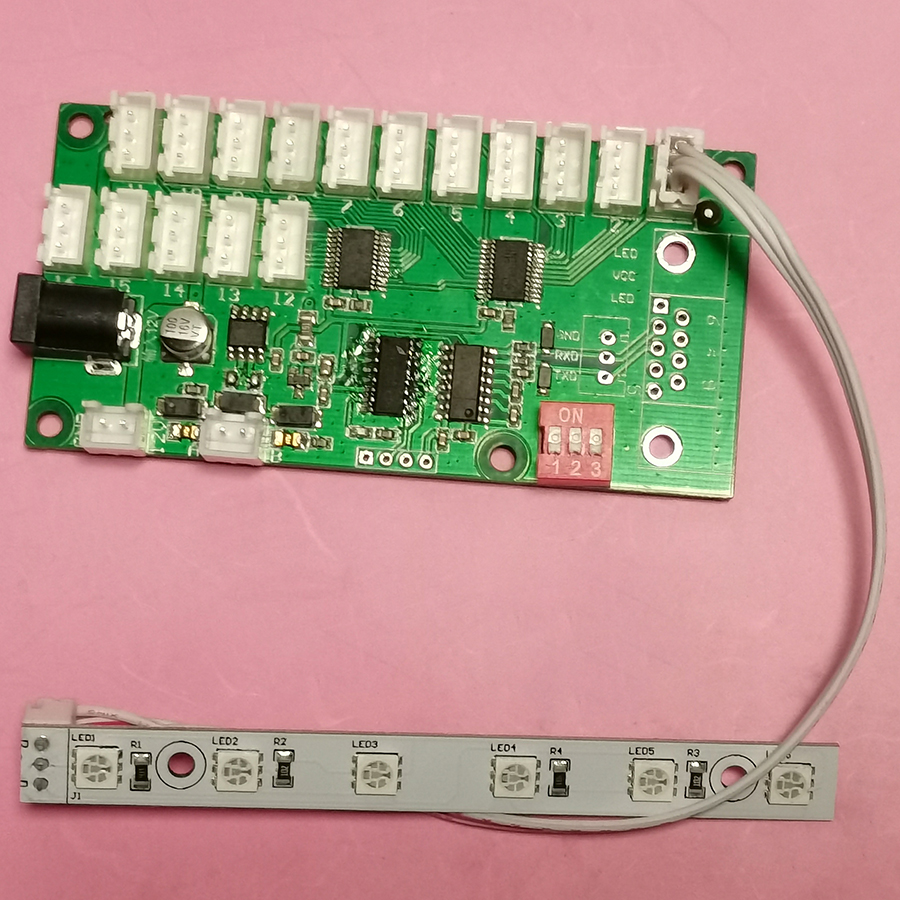 LED指標(biāo)燈控制板12V直流供電,采用RS485通訊,集成撥碼開關(guān),板子單獨(dú)使用,也可經(jīng)過調(diào)節(jié)撥碼開關(guān)多片板并聯(lián)使用,輸出32路接口,可接5V-12V之間的LED指示燈,控制板可應(yīng)用到貨架上指示貨架倉位,用到終端機(jī)上面做為功能指示,用到生產(chǎn)流水線提示工作崗位等。