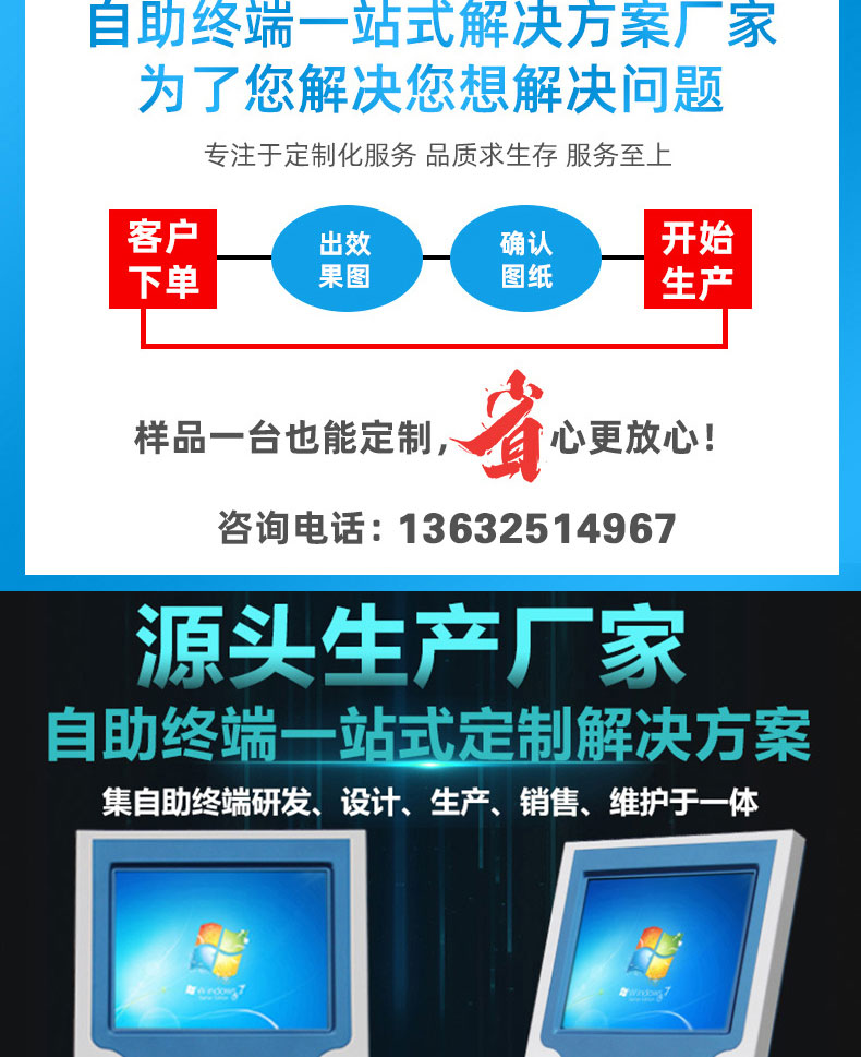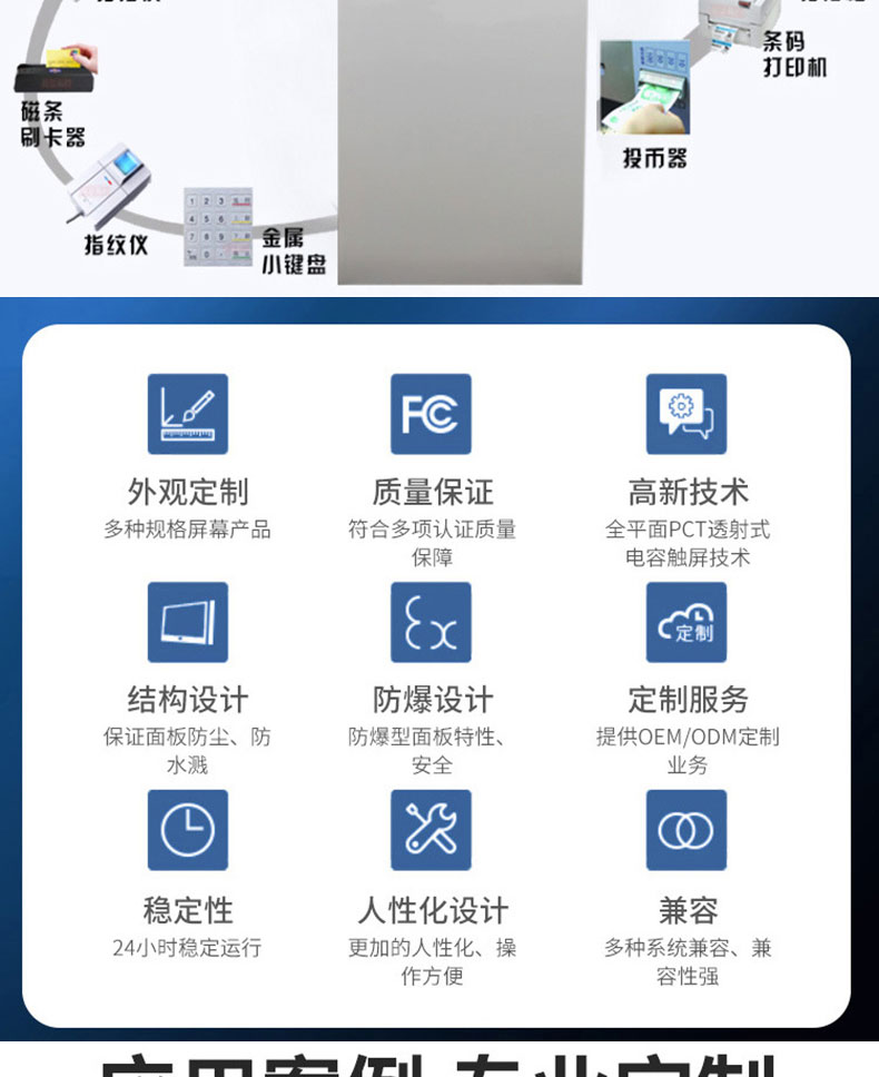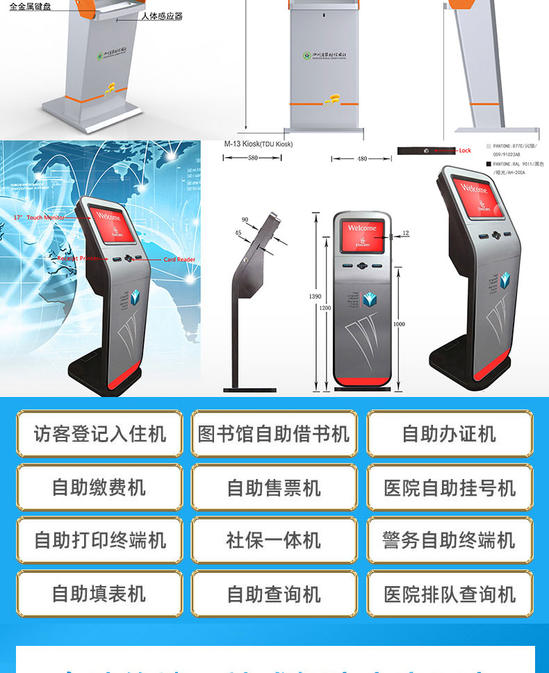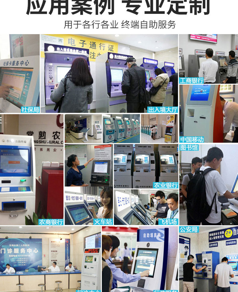 自助終端機(jī)定制:定制各種場(chǎng)景各種款式非標(biāo)終端機(jī);例如訪客機(jī)、景區(qū)自助取票機(jī)、醫(yī)院繳費(fèi)查詢機(jī)、醫(yī)院自助取單機(jī)、社保查詢機(jī)、室內(nèi)外廣告機(jī)、排隊(duì)叫號(hào)機(jī)、工控一體機(jī)、電力繳費(fèi)查詢機(jī)、圖書自助銷售機(jī)、便攜式計(jì)算機(jī)、酒店自助入住機(jī)、自助收銀機(jī)等終端。