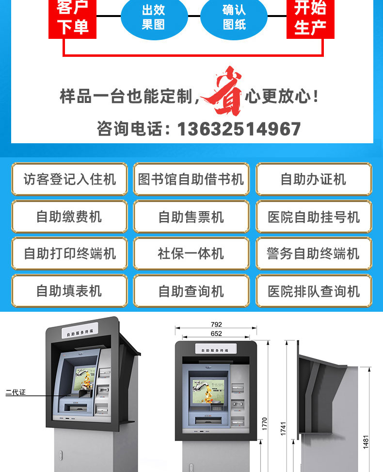 自助終端機定制:定制各種場景各種款式非標終端機;例如訪客機、景區(qū)自助取票機、醫(yī)院繳費查詢機、醫(yī)院自助取單機、社保查詢機、室內(nèi)外廣告機、排隊叫號機、工控一體機、電力繳費查詢機、圖書自助銷售機、便攜式計算機、酒店自助入住機、自助收銀機等終端。