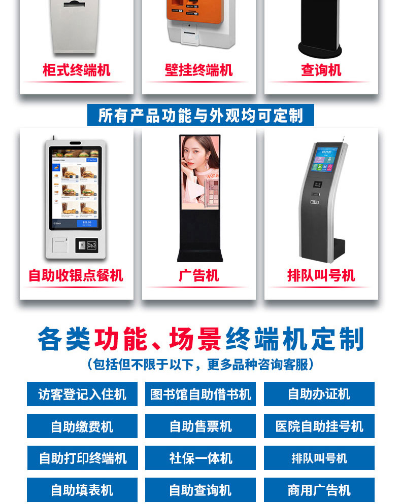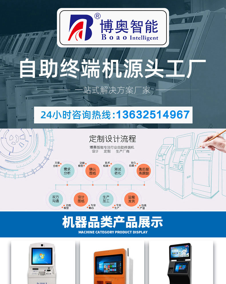 專業(yè)提供電腦觸控產(chǎn)品、自助服務(wù)終端的設(shè)計及生產(chǎn)服務(wù),主要產(chǎn)品自助終端機(jī)、自助打印機(jī)、自助取票機(jī)、自助查詢機(jī)、自助繳費(fèi)機(jī)、自助發(fā)卡機(jī)、自助政務(wù)一體機(jī),產(chǎn)品使用于各個行業(yè);醫(yī)院、學(xué)校、銀行、酒店、景區(qū)等。。。。。公司擁有專業(yè)的生產(chǎn)線,嚴(yán)格的質(zhì)量把控。耐心的咨詢服務(wù)團(tuán)隊及專業(yè)的技術(shù)負(fù)責(zé)團(tuán)體。