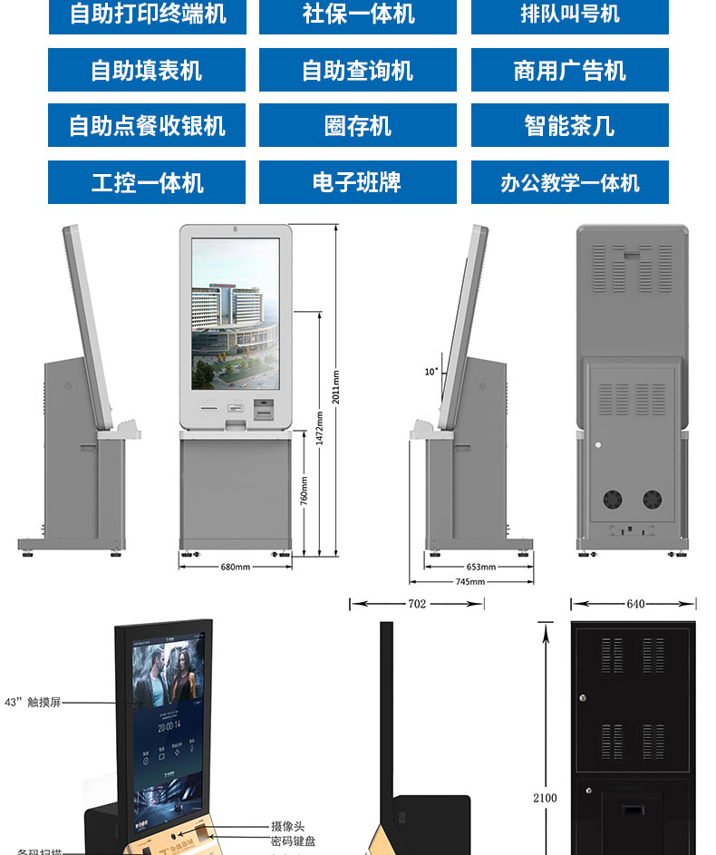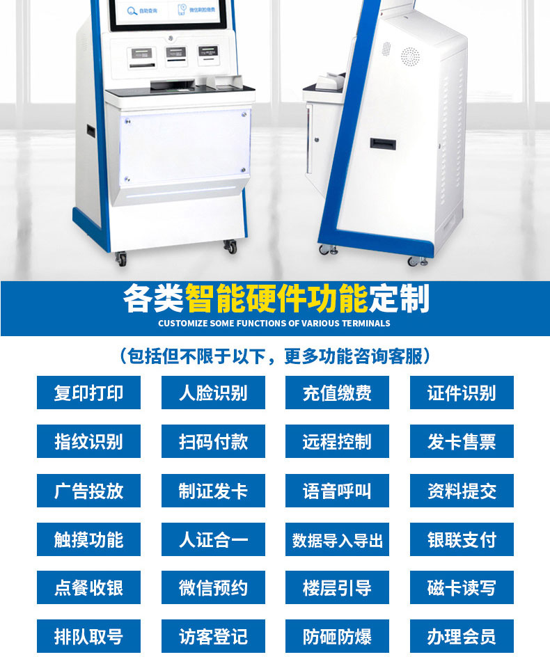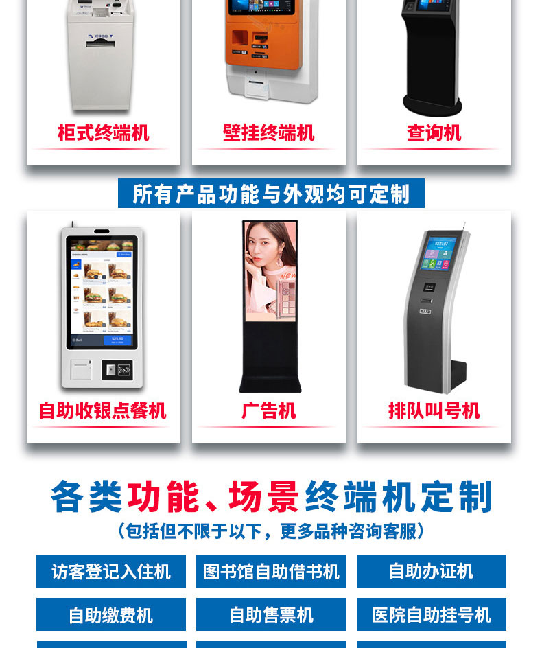 定制實(shí)用的自助終端設(shè)備,我們是專業(yè)。多種定制款式任意選擇,可根據(jù)需求定制外觀屏幕尺寸可選,配件數(shù)量可選,主機(jī)配置可選。