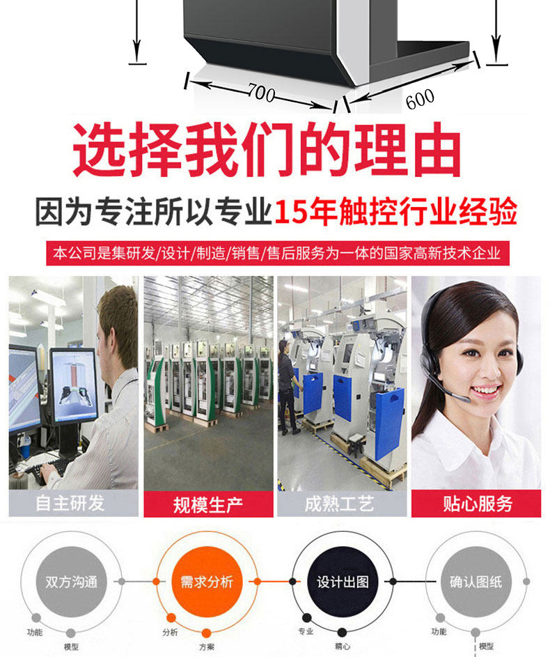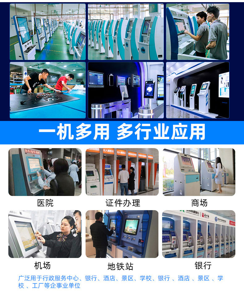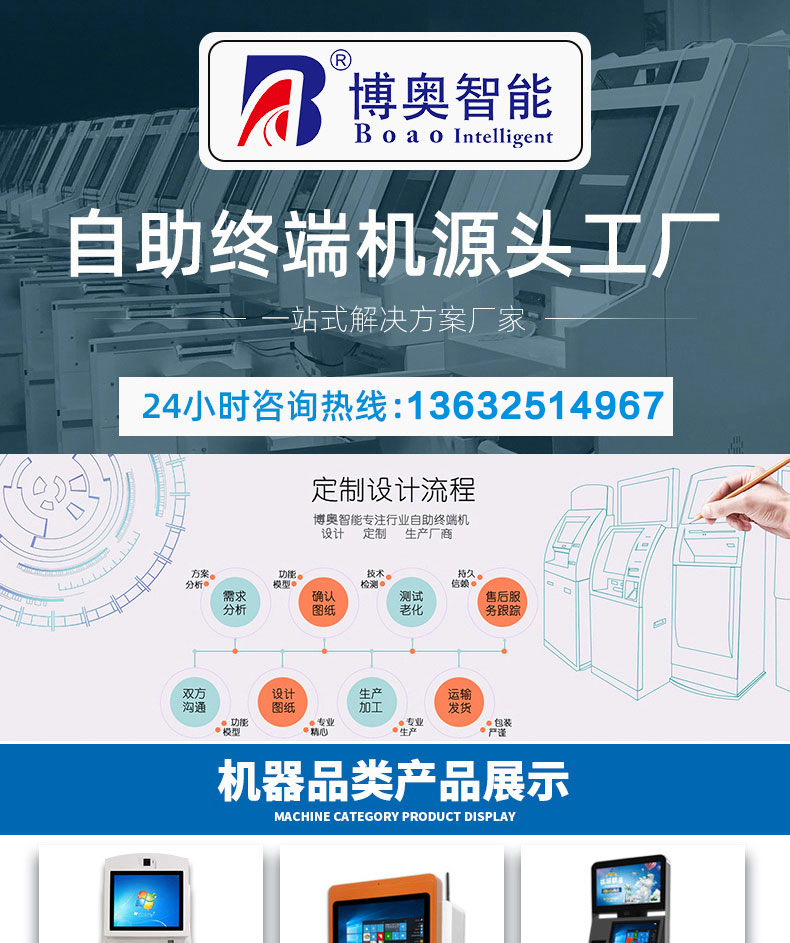 專業(yè)提供電腦觸控產(chǎn)品、自助服務(wù)終端的設(shè)計(jì)及生產(chǎn)服務(wù),主要產(chǎn)品自助終端機(jī)、自助打印機(jī)、自助取票機(jī)、自助查詢機(jī)、自助繳費(fèi)機(jī)、自助發(fā)卡機(jī)、自助政務(wù)一體機(jī),產(chǎn)品使用于各個(gè)行業(yè);醫(yī)院、學(xué)校、銀行、酒店、景區(qū)等。。。。。公司擁有專業(yè)的生產(chǎn)線,嚴(yán)格的質(zhì)量把控。耐心的咨詢服務(wù)團(tuán)隊(duì)及專業(yè)的技術(shù)負(fù)責(zé)團(tuán)體。