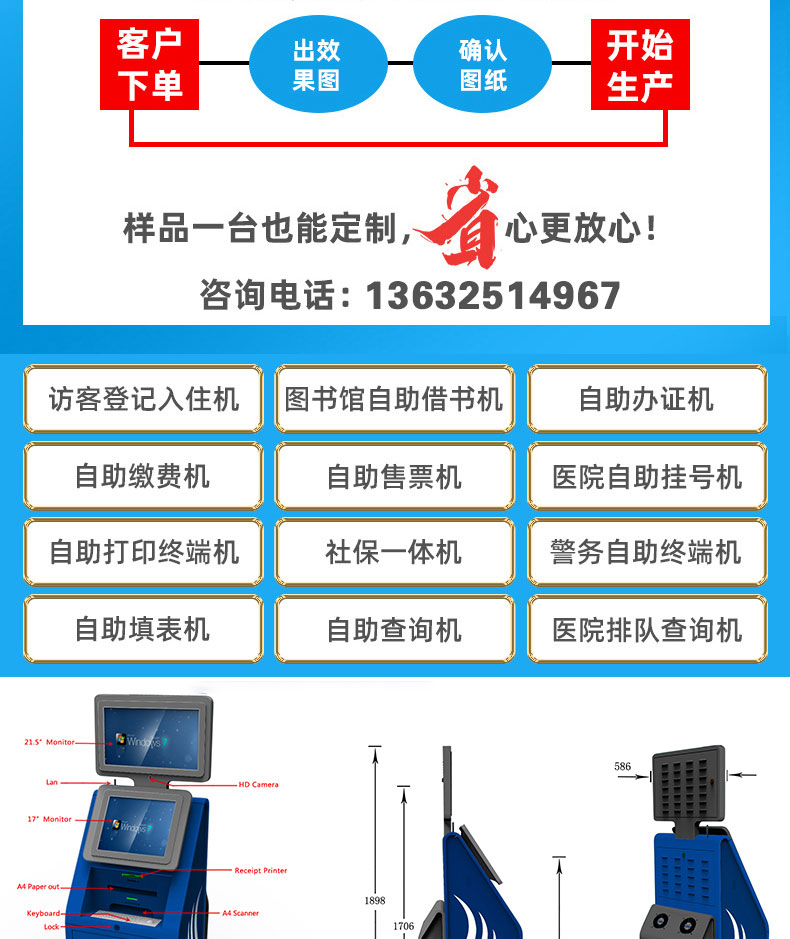 自助終端機(jī)定制:定制各種場景各種款式非標(biāo)終端機(jī);例如訪客機(jī)、景區(qū)自助取票機(jī)、醫(yī)院繳費(fèi)查詢機(jī)、醫(yī)院自助取單機(jī)、社保查詢機(jī)、室內(nèi)外廣告機(jī)、排隊(duì)叫號機(jī)、工控一體機(jī)、電力繳費(fèi)查詢機(jī)、圖書自助銷售機(jī)、便攜式計(jì)算機(jī)、酒店自助入住機(jī)、自助收銀機(jī)等終端。