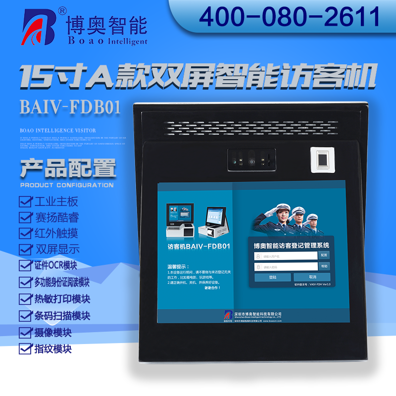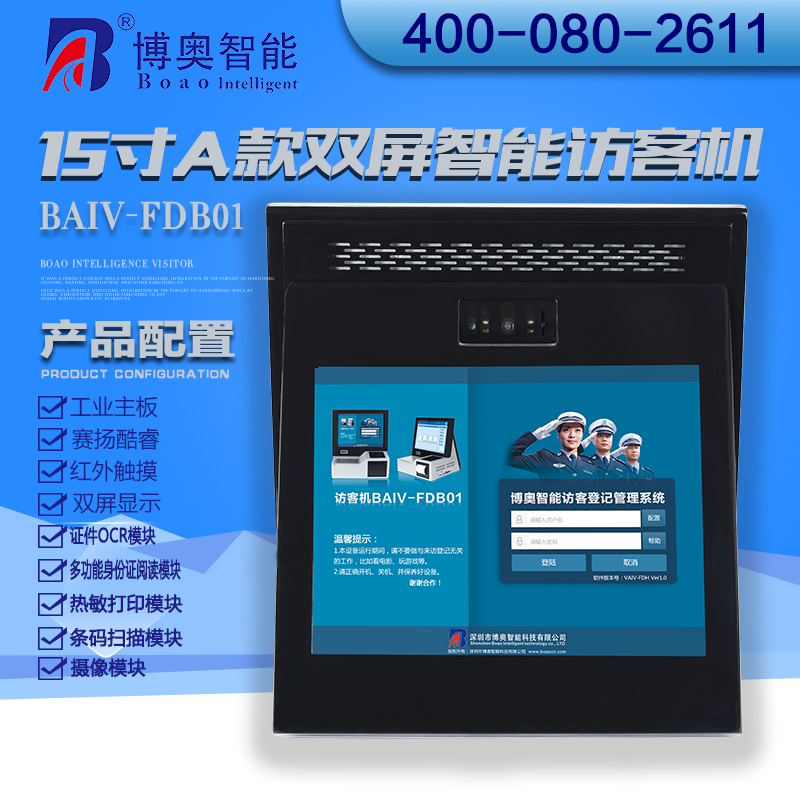 ? ? ? 15寸B款雙屏智能訪客機(jī)是博奧智能自主開發(fā),采用人體工程學(xué)與模塊化設(shè)計(jì)相結(jié)合,融合計(jì)算機(jī)、觸摸屏手寫、證件識(shí)別(OCR),射頻識(shí)別、指紋生物識(shí)別、熱敏打印、條碼、數(shù)碼攝像、自動(dòng)制證、硬件加密、網(wǎng)絡(luò)等技術(shù);選用鈑金材料、表面噴粉工藝加工出來的一款訪客管理終端,訪客管理終端內(nèi)部裝有WIN7操作系統(tǒng)SQL Server數(shù)據(jù)庫及我公司自主開發(fā)的訪客登記管理軟件等主要軟件,從而匯集成了一套完善的智能訪客登記管理系統(tǒng),它具有外觀精美,功能完善,操作方便等特點(diǎn)。