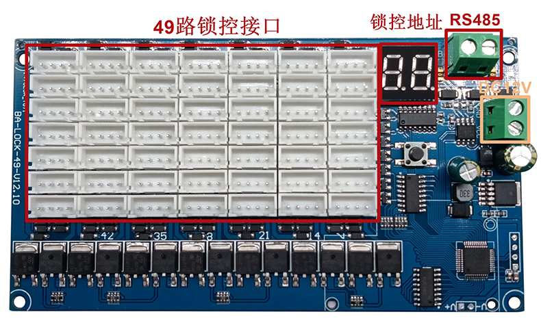 49路鎖控板又名為電子鎖控制模塊,主要用來(lái)控制各類格子柜門(mén)電子鎖的開(kāi)與關(guān),板子集成49路鎖控杜邦接口,485通信接口,DC電源接口,鎖控地址顯示模塊,一鍵全開(kāi)功能!板子通過(guò)485通信協(xié)議,實(shí)現(xiàn)電腦串口助手發(fā)送數(shù)據(jù)開(kāi)鎖和獲取箱門(mén)狀態(tài)反饋!
