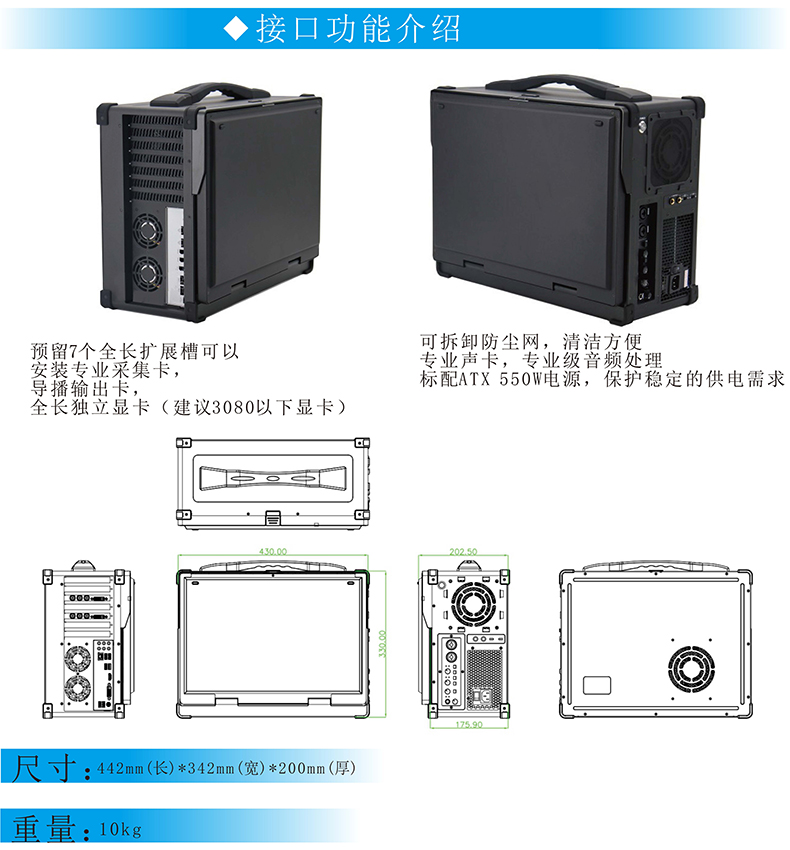 廣電影視導(dǎo)播直播錄播系統(tǒng)一體計算機工業(yè)級加固防振室外高亮便攜式17.3寸工控電腦支持定制加工國產(chǎn)系統(tǒng),采用鋁鎂合外殼,體積輕巧,性能穩(wěn)定,方便攜帶等特點;集成導(dǎo)播鍵盤、音頻模塊、視頻加速卡、導(dǎo)播輸出卡、17.3寸高亮屏,保證戶外使用也清晰可見,用于廣電行業(yè)和教育行業(yè)的專業(yè)級導(dǎo)播/直播便攜設(shè)備。