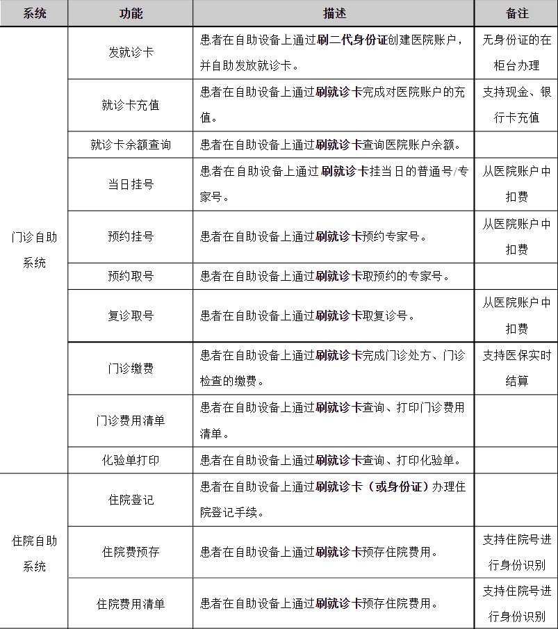 新增門診自助系統(tǒng),通過投放自助服務(wù)終端(含機上軟件),實現(xiàn):?發(fā)就診卡、就診卡充值、就診卡余額查詢、當(dāng)日掛號、預(yù)約掛號、預(yù)約取號、復(fù)診取號、門診扣費、門診退費、門診費用清單打印、化驗單打印等功能。
