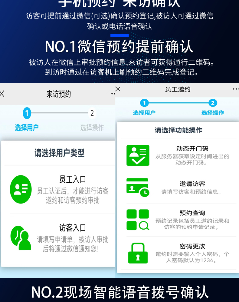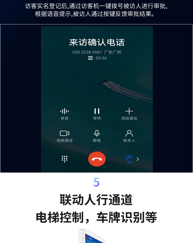 1.人證核驗(人證合一)? 2.電話撥號? 3.門禁聯(lián)動? 4.人行通道閘機? 5.電梯聯(lián)動??? 6.網(wǎng)絡(luò)攝像頭全景拍照? 7.車輛車牌識別控制系統(tǒng)? 8.訪客人車微信預(yù)約? 9.體溫檢測? 10.短信發(fā)送、確認 |