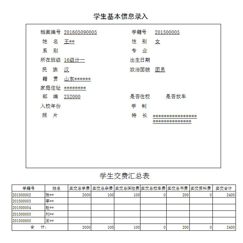 3. 統(tǒng)計查詢:系統(tǒng)提供學(xué)生交費匯總、班級每學(xué)期交費統(tǒng)計、費用匯總和欠費學(xué)生名單四個功能。學(xué)生交費匯總功能能夠計算出每個學(xué)期每個學(xué)生的各項交費情況;班級每學(xué)期交費統(tǒng)計則方便地展示了每個班級在不同學(xué)期的交費情況;費用匯總功能可以統(tǒng)計出學(xué)校在某個時間段內(nèi)的總收費情況;欠費學(xué)生名單則列出了未繳納費用學(xué)生的名單,方便進行催費工作。