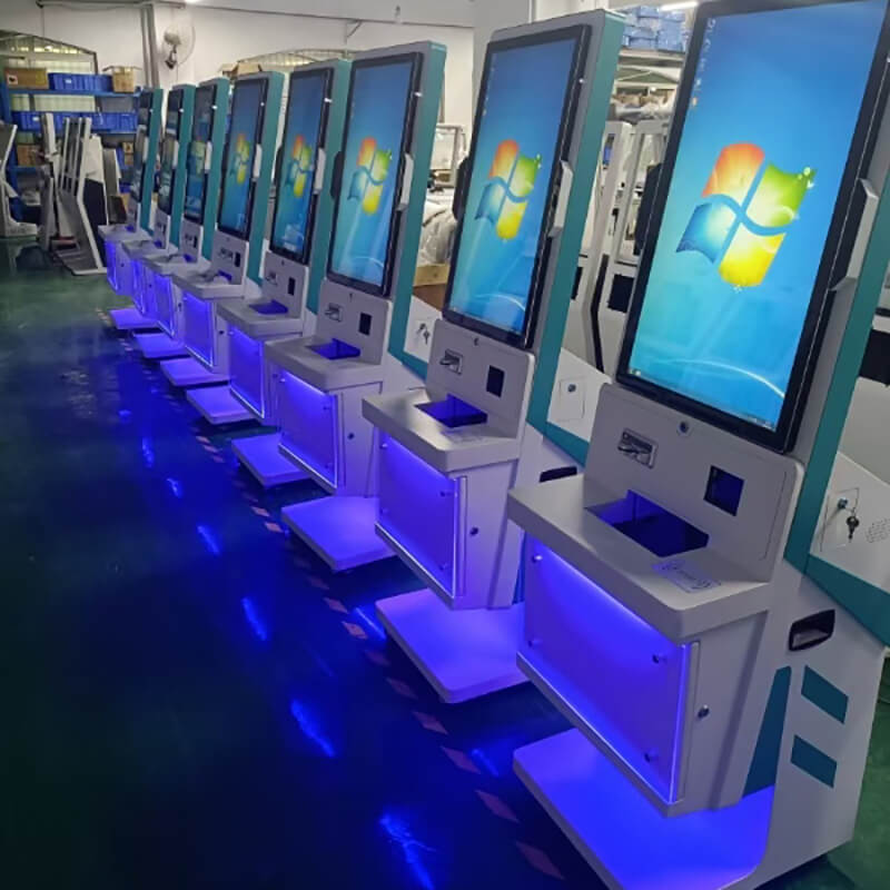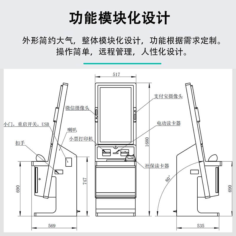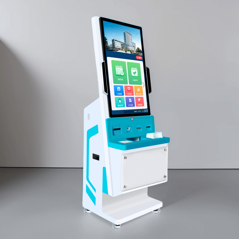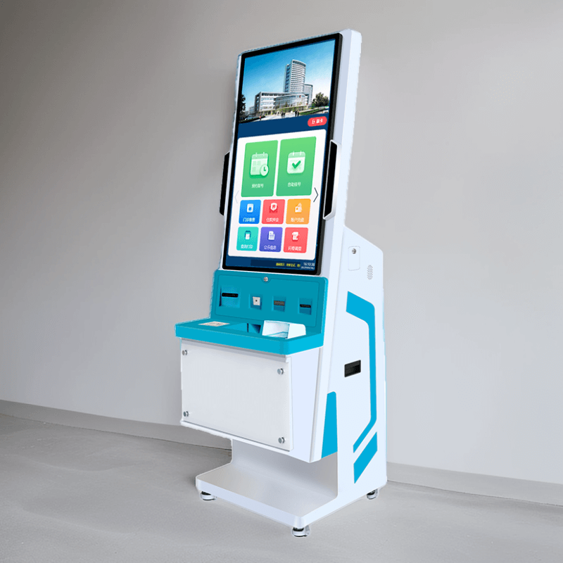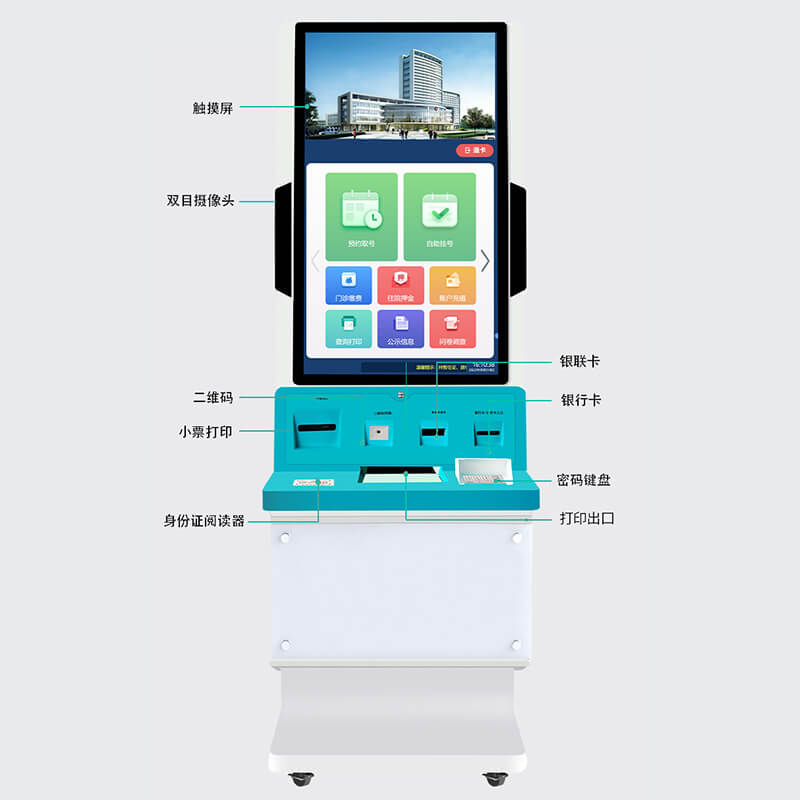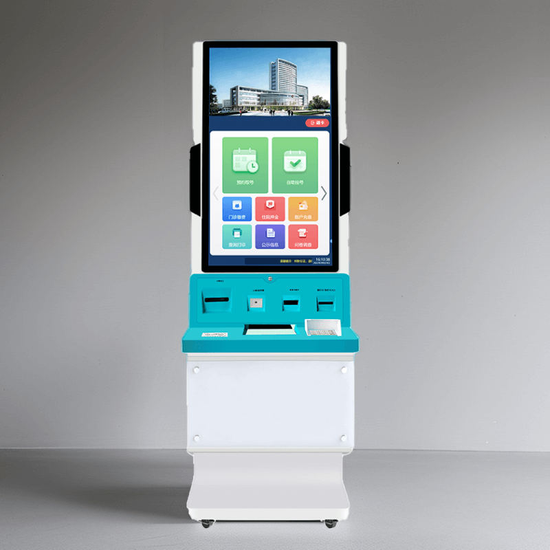 該終端機(jī)采用 32 英寸 IPS 高清觸控屏,分辨率 1920×1080,亮度 300cd/m2,響應(yīng)時(shí)間 5ms,支持 10 點(diǎn)觸控;配備雙 200 萬(wàn)像素支付寶 / 微信專(zhuān)用攝像頭,支持二維碼高速識(shí)別與光線自適應(yīng);集成符合 ISO 14443 標(biāo)準(zhǔn)的二代身份證讀卡器及全國(guó)統(tǒng)一社保接口的社保讀卡器;打印系統(tǒng)含熱敏式小票打印機(jī)(150mm/s 打印速度)與可選激光 / 噴墨 A4 打印機(jī);處理器為四核 ARM Cortex-A55(2.0GHz 主頻,可選 Intel 賽揚(yáng)),存儲(chǔ) 4GB RAM+64GB ROM(可擴(kuò)展至 128GB);接口包括 4×USB 3.0、RJ45 網(wǎng)口、HDMI、DC 電源接口及 WIFI / 藍(lán)牙模塊;電源 AC 220V±10%/50Hz,功耗≤150W(待機(jī)≤10W),工作環(huán)境溫度 0℃~40℃、濕度 10%~90%(無(wú)冷凝)。